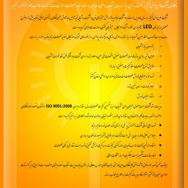 - طراحی، ساخت و تولید انواع محصولات جهت لامپهای LED منطبق با شرایط معماری.